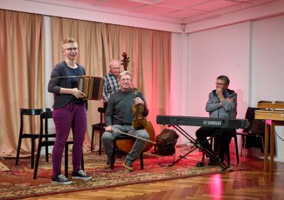 Die Stobedegäste aus dem Toggenburg Katja Bürgler und aus Appenzell Albert Kölbener eröffneten den zweiten Teil. Nach einer Gesangseinlage im Stil vom "Schacher Seppeli" spielte Baazli mit seinen Musigkollegen zum Tanz auf, und die Teilnehmer:innen des vorgängigen Kreistanzkurses präsentierten zwischendurch das Gelernte mit Begeisterung. In bewährter Stobete-Manier spielten Toggenburger und Appenzeller Musikanten in spontan wechselnden Besetzungen bis spät in die Nacht zusammen, und auch das Johlen und Zäuerlen kam nicht zu kurz.