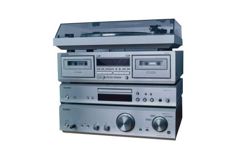 Ein Musikturm (CD, Kassette, Plattenspieler und Radio) ist ein typisches Hi-Fi-Gerät aus der Übergangszeit zwischen analoger und digitaler Musik (1980-2000er Jahre).